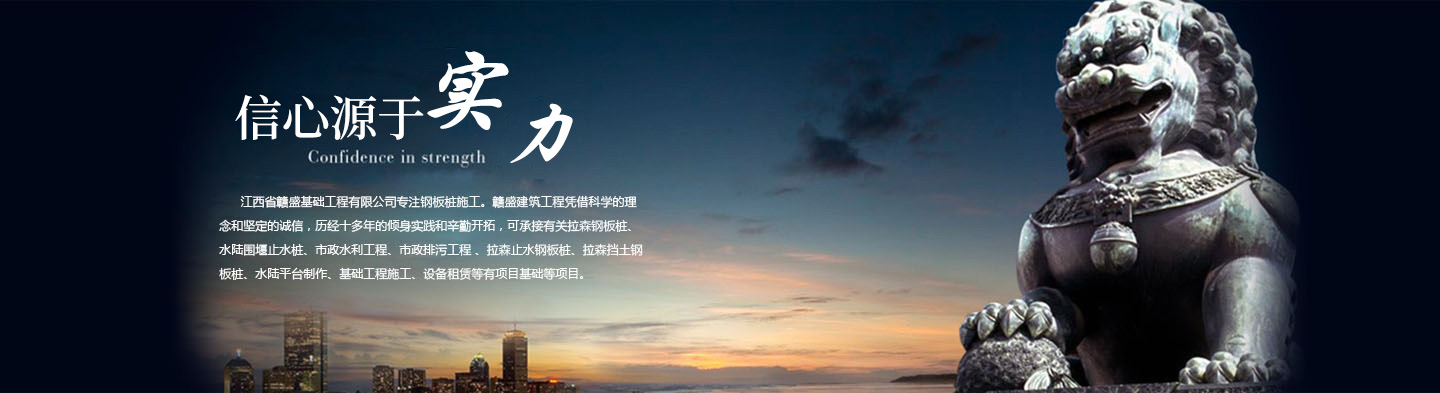 江西省贛盛基礎(chǔ)工程有限公司鋼板樁施工。贛 盛建筑工程憑借科學(xué)的理念和堅(jiān)定的誠(chéng)信,歷經(jīng)十多年的傾身實(shí)踐和辛勤開拓,可承接有關(guān)拉森鋼板樁、水陸圍堰止水樁、市政水利工程、市政排污工程 、拉森止水鋼板樁、拉森擋土鋼板樁、水陸平臺(tái)制作、基礎(chǔ)工程施工、設(shè)備租賃等有項(xiàng)目基礎(chǔ)等項(xiàng)目。 ...